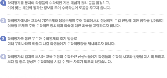 현재 전 세계적으로 수학교육 개혁의 방향은 문제 해결력, 수학적 추론, 수학적 연결성, 의사소통 등이 강조되고 있습니다. 일반적으로 평가는 학년에 맞는 여러 종류의 평가가 있으며 평가 자체는 교수 학습방향을 결정하는 중요한 모티브가 됩니다. 따라서 평가를 실시하는 기관은 정확한 연구와 이해를 바탕으로 평가의 목적과 방향을 잡아 학생들에게 유용한 자료를 제공할 수 있어야 합니다.